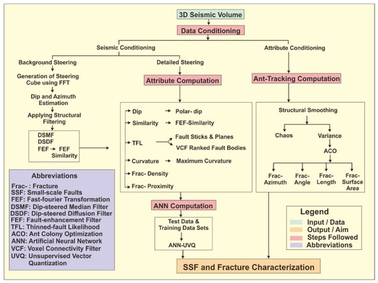 The workflow employed for the current study incorporated the analysis of data conditioning, evaluation, and selection of seismic attributes, neural network computation, and artificial ant-tracking (Figure 2). In the first step, the data were conditioned, a process that incorporated seismic conditioning. The seismic conditioning included geostatistical and structural filtering to enhance and sharpen the structural features of the seismic data. In the second step, multiple structural attributes were analyzed to execute the selection process. The seismic attributes, which were extracting the best possible results of discontinuities, were shortlisted. In the third process, the shortlisted seismic attributes were tested and trained for the neural network analysis. In the fourth and last step of the study, the optimum attributes were selected and conditioned to process the ACO algorithm. The ACO was applied to evaluate the fracture network parameters.