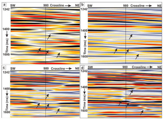 Seismic sections at inline 665: (a) original seismic data; (b) dip-steered median filter (DSMF) data; (c) dip-steered diffusion filter (DSDF) data; and (d) fault enhancement filter (FEF) data. The black arrows show the differences in the identified discontinuities. The FEF shows the best results of identifying the discontinuities.
