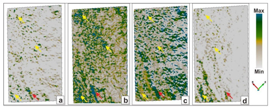 A similarity algorithm was incorporated in the study to recognize the coherency in the inline and crossline directions, which allowed us to interpret the major discontinuities in specific directions. The full steered and non-steered similarity attributes were applied by using different windows to study the differences of the dip influence towards the discontinuities. Dip-steering eliminated the structural features of the similarity attribute, and precise results of faults were produced, whereas the non-steering similarity excluded the steering cube. The full-steering attribute proved to be more helpful than the non-steering attribute to delineate the discontinuous features (Figure 6a,b). Since the similarity attribute was very sensitive to the noise, the fault enhancement filter was also applied to the similarity attribute. The FEF improved the precision and sharpened the continuity of the faults. The discontinuities were compared through full-steered similarity, non-steered similarity, and FEF-similarity (Figure 6a–c). A comparatively large window was used for increased continuity, high-resolution results, and to extract the maximum information of the discontinuous features. Since the study area was relatively stable and the small scale faults and fractures are present. Thus, the effects of discontinuities were sharply analyzed through similarity attributes. The results of FEF-similarity were more continuous and sharp than the dip-steering similarity attributes. The results were also analyzed on the FEF similarity cube, which showed the significant discontinuities (yellow arrows) in the studied seismic volume (Figure 6d).
