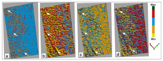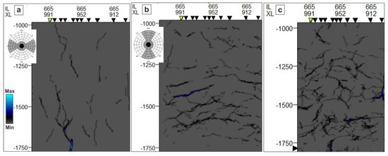 Multiple curvature attributes were applied in the current study; these were maximum curvature, minimum curvature, the most positive and the most negative curvature attributes. Each of these curvature attributes had different parameters regardless of their signs to detect the fault and fracture discontinuities [11]. The results showed that the maximum curvature attribute was the most beneficial in terms of delineating the fractures in the study area (Figure 5a–d).