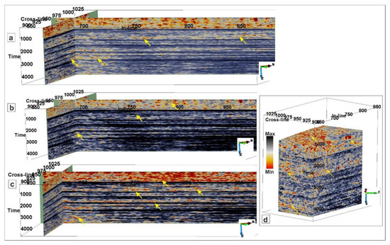 Seismic sections showing the major discontinuities: (a) full-steered similarity, (b) non-steered similarity, and (c) FEF-similarity attributes. The FEF-similarity gave the best results. (d) FEF-similarity cube. The yellow arrows represent major discontinuities.