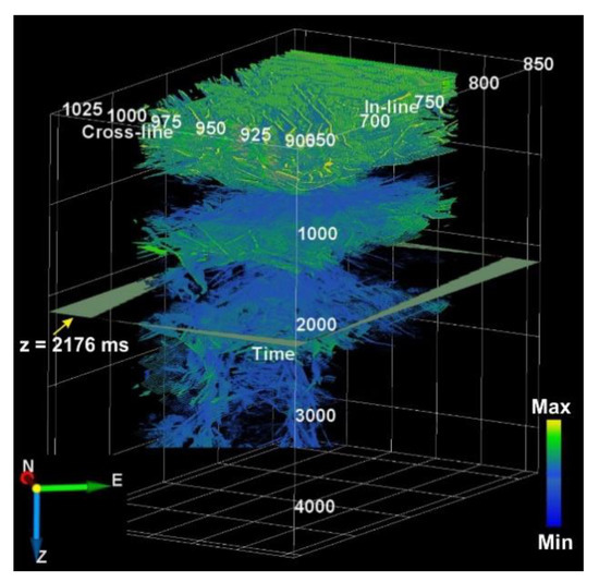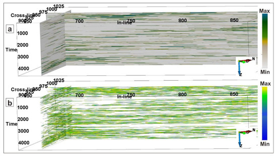 The fracture planes and sticks were also extracted using the discontinuous TFL volume as input. The fracture planes proved to be quite beneficial in recognizing the sweet spots for prospect evaluation, field development, and future drilling of exploration and appraisal wells [85]. The fractures were interpreted and visualized on the cube as a stick, and all sticks that belonged to one fracture were merged into a single stick set. Thus, a single fracture stick set was comprised of an unordered collection of the interpreted sticks. The minimum TFL value of 0.01 was used in the current study. The minimum value of sticks per fracture was applied, which helped to identify the small scale fractures that had small throws. The minimum vertical overlap rate of 0.6 was used to extract maximum tilted fractures, because a value greater than 0.6 may have extracted maximum fractures with a risk of picking up more noise. The minimum fracture length per z-slice of 250 was applied to extract the maximum fractures with smaller heaves. The feature of merging fractures along z-slices was also applied, and this increased the possibility of capturing the lateral continuity of fractures. The results of the extracted fracture planes and sticks generated for the seismic study volume are shown in Figure 8b.