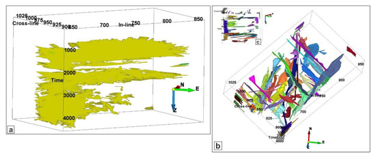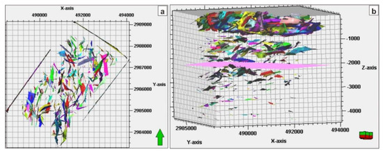 The discontinuity features were further observed using the fault discontinuity attribute volume to create and rank the fracture bodies. The resultant TFL volume was used as input for estimating the fracture bodies using the VCF. The VCF is an effective tool to create continuous bodies based on the amplitudes in a stored volume. A voxel is defined as the volume around one sample. The sample’s interconnection was computed based on amplitude criteria and geometrical spreading settings. The voxel connectivity filter was applied using the envelope of the amplitudes, which were higher than the 0.6 value; the envelope was defined for the fracture bodies to be computed. The propagation was done in all directions (26) using the six faces, twelve edges, and eight corners adjacent to the current seed. The bodies that were larger than 100 voxels were processed as relatively large scale fractures, and the output volume was processed using the body-size. The results of the generated connected fracture bodies were displayed using the voxel connectivity filter, as shown in Figure 8a. The results showed the orientations of the connected small scale and large scale fracture bodies. The facture bodies were oriented mostly in the east–west directions, and large-scale fracture bodies were present at the top, whereas the small scale fracture bodies were present at the bottom of the study area.