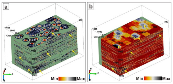 (a) Fracture proximity cube; (b) fracture density attribute cube. The yellow arrows show the regions of maximum fracture activity.