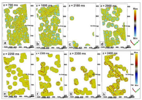 ANN–UVQ time slices highlighting the presence of fractures at (a) 700 ms, (b) 1600 ms, (c) 2180 ms, (d) 2900 ms, (e) 2250 ms, (f) 2300 ms, (g) 2350 ms, and (h) 2400 ms.