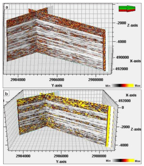 The term chaoticness is used for highlighting the reflector discontinuities using differences in azimuth and dip [77]. The maximum value of chaoticness indicates the regions of discontinuities such as fractures, faults, or unconformities [86]. The signal pattern of the chaotic texture also indicates the migration of gas pathways. Here, the 3D map of the chaos attribute showed many discontinuities in the upper portion of the seismic section, while there were fewer discontinuities in the lower area. (Figure 14a).