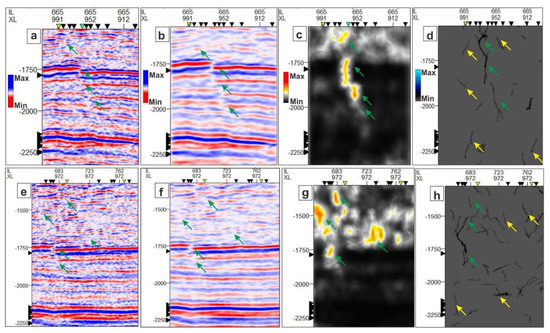 The generated background steering cube was further incorporated while applying structural filtering. The dip-steered median filter (DSMF) was applied to remove random noise and to improve the dip and azimuth information of the generated steering cube. The noise removed was analyzed by the DSMF using the mathematics attribute. A diffusion filter was then applied on the dip-steered median filter to make the smoothing influence obsolete on the discontinuous features. The dip-steered diffusion filter (DSDF) enhanced the low-quality seismic data nearby faults and fractures. The two DSMF and DSDF filters were joined together to design an FEF. The FEF was based on a similarity threshold, and the data were smoothed (DSMF) away from the discontinuities and sharpened (DSDF) at the fault locations. Both similarity and steering cubes were incorporated in the study to establish a filter that had the same-sized window as the median filter. The results of the fault enhancement filter enhanced the sharpness of the faults and fractures, reduced the noise, and increased the smoothing of the reflectors. The FEF was then applied to the seismic volume to delineate the discontinuous features. The results provided a comparison of the original seismic (Figure 3a), dip-steered median filter (Figure 3b), dip-steered diffusion filter (Figure 3c), and the fault enhancement filter (Figure 3d) at inline 665. The results showed that the FEF effectively showcased the discontinuities marked by black arrows, which were not easily identified on the original seismic, DSMF, and DSDF data. The FEF and detailed steering cube were further used in the multi-attribute analysis to characterize the SSF and fracture network.