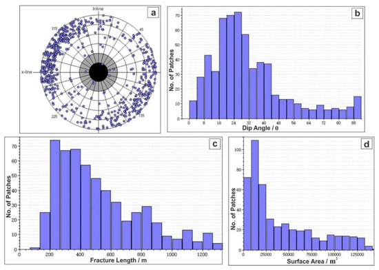 Downsampling is effective in controlling the density of the various points of every patch. The minimum patch size sets the minimum number of points for fracture patches. The extraction background threshold and extraction sampling threshold control the least threshold signal value for the extraction and estimation of fracture patches. The extraction sampling distance controls the least distance by defining the radius amid extraction points. The deviation from a plane (DFAP) controls the orientation and deviation of a fracture from the surface of the plane. The DFAP plays an essential role in distinguishing fractures. A higher value of the DFAP decreases the possibility of extracting more fractures and vice versa. A DFAP of 9 was used in the study because the fractures merged into each other when a higher value of the DFAP was used.