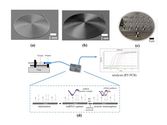 - Potrich, C.; Vaghi, V.; Lunelli, L.; Pasquardini, L.; Santini, G.; Ottone, C.; Quaglio, M.; Cocuzza, M.; Pirri, C.F.; Ferracin, M.; et al. OncomiR detection in circulating body fluids: A PDMS microdevice perspective. Lab Chip 2014, 14, 4067–4075. [Google Scholar] [CrossRef]