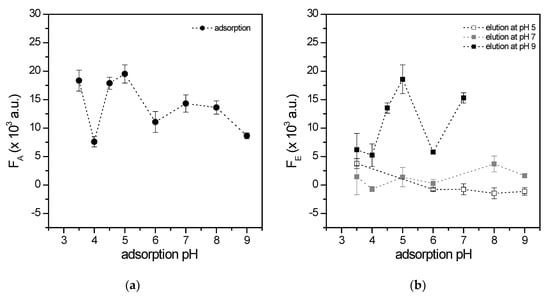 MicroRNA adsorption (Panel (a)) and elution (Panel (b)) from flat polydimethylsiloxane (PDMS) surfaces as a function of pH. Panel (a): 10 ng of synthetic miR-1246, conjugated with the florescent dye TAMRA, were incubated on the silanized surfaces at different pH. After three washes with the same buffer as for incubation, the fluorescence of the adsorbed microRNA was measured (FA). Panel (b): fluorescence of the eluted microRNA (FE). The microRNA adsorbed at different pH was eluted from the surfaces with buffers at three different pH values: pH = 5 (white squares), pH = 7 (gray squares) and pH = 9 (black squares). After elution, surfaces were imaged and the resulting signal was subtracted from FA, obtaining values of the eluted microRNA (FE). Data are means of at least three independent replicates, while error bars represent standard errors.