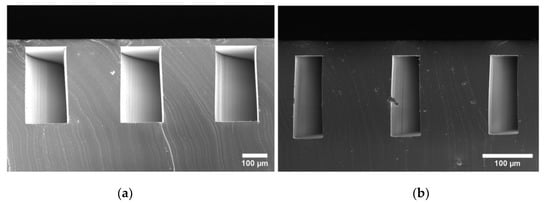 FESEM images of microdevice A (Panel (a)) and B (Panel (b)). Microdevices were cut to expose microdevice channels. White bars represent 100 µm.