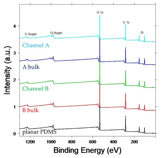 X-ray photoelectron spectroscopy (XPS) survey spectra taken at 0° take-off angle. Spectra were taken inside microdevices channels (curves named Channel A and Channel B) and outside channels, i.e., on freshly cut microdevice surfaces (A bulk and B bulk). A planar PDMS surface was also measured for comparison (planar PDMS).