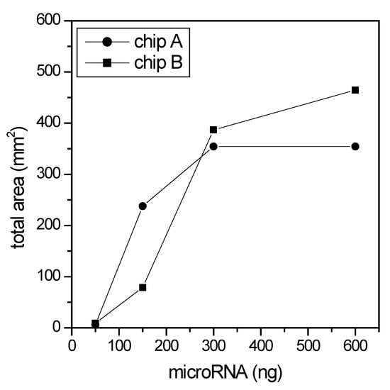 Next, we moved to consider the effect of the different total channel surface on the maximum loading capacity of the two kinds of microdevices. In Figure 7, an estimation of the total area covered by fluorescent miRNAs versus the quantity of miRNAs fluxed through the chip is reported. This titration confirmed that Microdevice B, which presents a higher total channel surface (S/V ≈ 46.2 mm−1), adsorbs a higher amount of microRNA compared to Microdevice A (S/V ≈ 18.0 mm−1). For this experiment all other parameters than concentration, i.e., flux rate, microRNA insertion time, flux and washing time, were kept constant. The insertion of 300 ng of pure microRNA saturated the capturing ability of Microdevice A, while a double amount was still well adsorbed by Microdevice B. The total area possibly occupied by microRNA was calculated as 356 mm2 for Chip A and 460 mm2 for Chip B. For Chip A, this value was reached with the adsorption of 300 ng of microRNA, while the double was still adsorbed by Chip B, reflecting the different S/V for the two microfluidic devices. The S/V of Chip B is indeed about the double than S/V of Chip A.