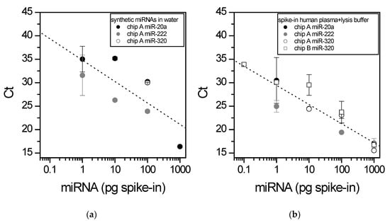 RT-qPCR results expressed as threshold cycles (Ct) measured when different amounts of synthetic microRNA were spiked in water (Panel (a)) or in blood plasma (Panel (b)). The absorbed microRNA was reverse transcribed directly on-chip, while the cDNA products were amplified in standard conditions. A dotted line, from a logarithmic fit of all data is also shown.