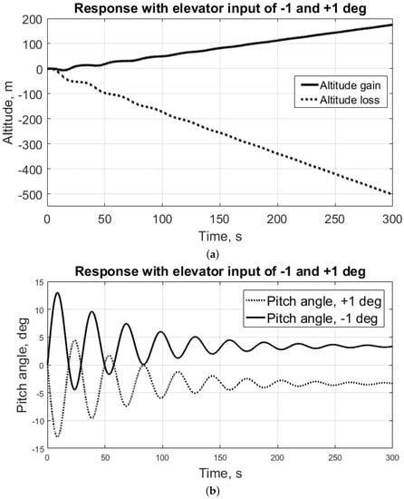 Response of the aerodynamic model of A UAV with negative and positive elevator inputs. (a) Effect on altitude. (b) Effect on pitch angle.