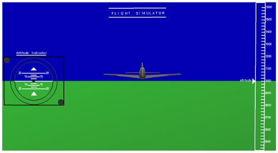 In order to mimic the forces experienced by an operator of a manned aircraft in a flight simulation, forces are calculated and rendered using the relation expressed in Equation (6). It can be seen that the magnitude of force increases with the UAV size and square of speed. The control parameter in our case is in Equation (2), which depends on the control stick deflection simulated by the haptic device. is updated based on the input from the operator and flight parameters (forward and vertical velocity, pitch rate, angle and altitude) are calculated by solving the first order differential equations (FODEs) of the mathematical model. Pitch angle is passed to the UAV model for the visualization of pitch rotation. The speed of the UAV is obtained from the forward and vertical velocities u and w, respectively. Similarly, the altitude of the UAV is determined from Equation (2) using FODE. These flight parameters are then passed to the graphics and force rendering engines to update the visualization in real time and render forces through the haptic device to the operator. The graphical user interface shown in Figure 4 consists of the UAV model, an attitude indicator used to give immediate and direct indication to aircrafts pitch and bank in reference to an artificial horizon, and an altimeter to show the altitude of the UAV.