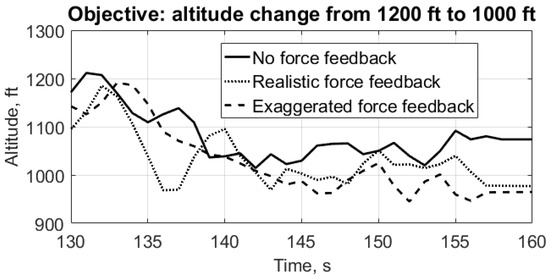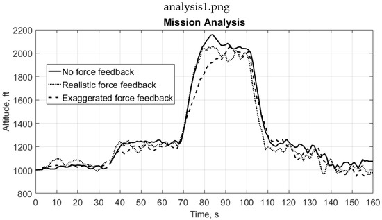 In experiments, when users were asked to decrease the altitude from time interval 100 to 130 s and 130 to 160 s to 1200 ft and 1000 ft, the ‘’ is reduced for the realistic and exaggerated force feedback condition, as shown in Table 6. This was due to the fact that decreasing the altitude caused the nose of the UAV to rotate downward causing the increased speed as explained previously through Figure 3. As a result, users experienced an additional increased force feedback which pushed the control stick away from an operator, hence reaching the set point in less time. This also affected operators’ performance in the altitude holding task because the force calculation (i.e., Equation (6)) depends on the square of the UAV speed.