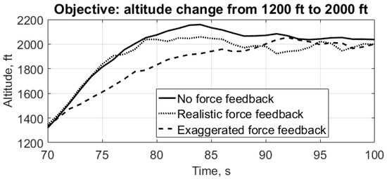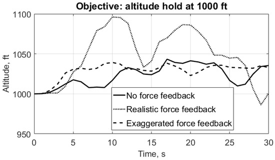 If we look at the average of first 30 s time of all the 15 users, it can be seen that users experiencing exaggerated force feedback have a better performance in terms of achieving a close to steady state condition and with the smaller % overshoot, as presented in Table 5. Similarly, from time intervals 35 to 70 s and 70 to 100 s in Figure 10 and Figure 11, we can see that the overshoot is controlled using force feedback conditions. The numerical values presented in Table 5 support this analysis. Hence, we concluded that in the altitude hold task, where users have to increase the altitude and hold it to the specified value (i.e., 1000 ft, 1200 ft and 2000 ft) for 30 s, force feedback conditions help in controlling the overshoot, whether the altitude difference is small or large.