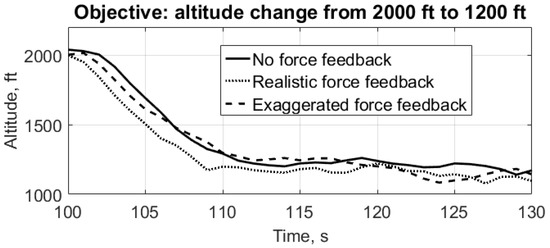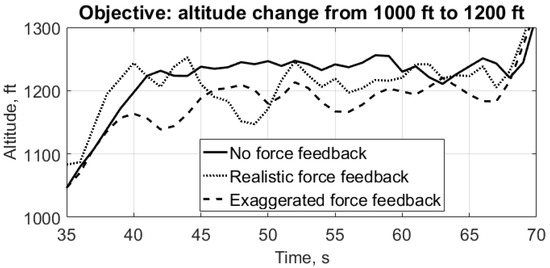 Figure 9, Figure 10 and Figure 11 illustrate the performance analysis for three conditions on the basis of rise time and overshoot. It depicts the average altitude holding capability of pilots at different altitude instances. To determine the effect of force feedback on operator’s performance in terms of achieving the set point (i.e., altitude) we calculated rise time for increasing altitudes from time intervals 35 to 70 s and 70 to 100 s, respectively, as presented in Table 4. We can not use the rise time as a performance parameter from 0 to 30 s because the simulation starts at 1000 ft, and the operator only has to hold that altitude for 30 s.