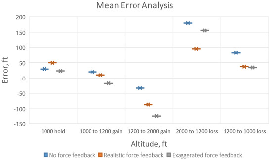 We calculated error at different altitude instances to further evaluate our results and it supports the above analysis that with force conditions, the operator performance for the altitude hold task was better, i.e., resulted in low error values. The mean values of errors are shown in Figure 14.