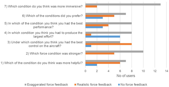 Figure 15 shows the questions with the corresponding responses of the operators. Most of the operators agreed that by incorporating haptic feedback in the UAV controls, the mission objectives can be achieved effectively. However, the answer to question 4 shows a controversial situation in which 8 out of 15 operators thought that haptic feedback demanded more effort. When asked about this in the follow-up interview, most of the operators clarified that when they experienced force intermittently, they pushed the control stick away from them, which compromised their performance and required more physical effort to maintain the desired altitude.