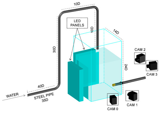 The experimental facility (Figure 2) consists of a vertical steel pipe with nozzle diameter D = 21 mm, from which a vertical plunging jet falls in a Plexiglas prismatic tank with a side equal to 14D and a height equal to 24D. The water flow is recirculated in a closed circuit, supplied by a centrifugal pump. The test water flow rate was Q = 0.5 L/s, measured by means of an electromagnetic flow meter.