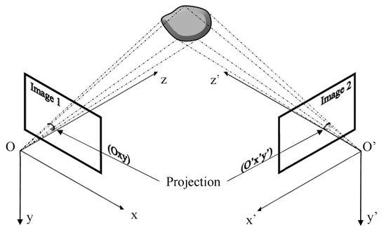 The volumetric shadowgraph technique used in this study allows us to describe the three-dimensional evolution of air bubble shape and position, based on the observation of the bubble boundaries from different points of view [39,40]. The boundary projection in the Euclidean space defines a cone whose axis joins the center of the camera lens to the bubble centroid. This principle is illustrated in Figure 3, considering the projection of an object on two different planes, Oxy and O’x’y’, with the local z-axis indicating the camera’s optical axis.