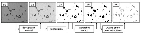 A specific image processing algorithm (Figure 4) has been used to detect the air bubble boundaries of each recorded data set. The procedure entails two preliminary steps: the first is the background removal (Figure 4b), obtained by subtracting from each image the median image calculated over the entire data set, the second step is the image binarization (Figure 4c) by means of the IsoData threshold algorithm [45]. The latter allows for the detection of the bubbles characterized by a clearly visible boundary, removing the out-of-focus bubbles. In the presence of relevant void fraction, air bubbles tend to aggregate, forming a bubble cluster. The direct application of the shadowgraph technique on images containing bubble clusters involves the erroneous detection of a single bubble for the entire cluster. In order to avoid this inconvenience, the watershed technique has been used (Figure 4d). It considers a grayscale digital image as a relief map, with the gray levels of pixels indicating their elevation in the relief [46]. Considering a bubble cluster as a series of watersheds adjacent to each other, the watershed lines allow for their division and, consequently, their detection [47,48]. The last step consists of bubble boundary detection, obtained by considering the pixel outline of the bubbles (Figure 4e).