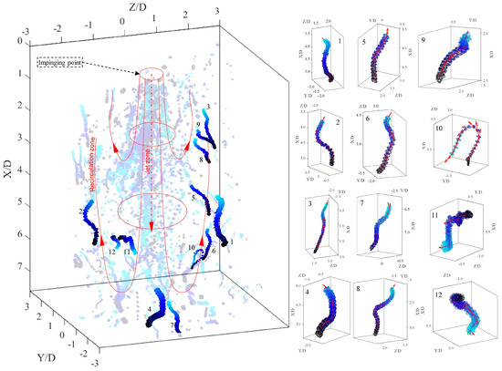 Figure 5 shows the reconstructed sequence of positions taken by selected air bubbles, composed of 26 consecutive frames. Some air bubbles have been observed inside the jet zone and show a vertical downwards path, some other bubbles move in the lateral recirculation zones with an upwards spiraling path.