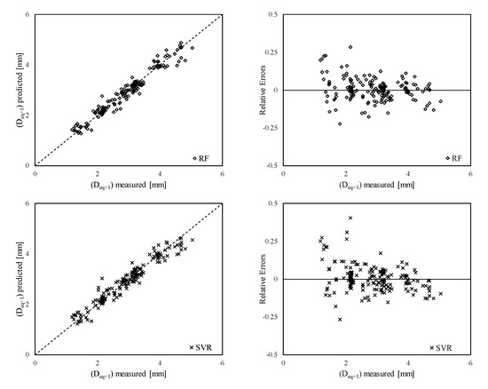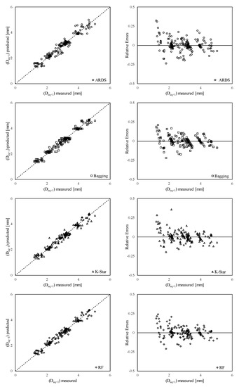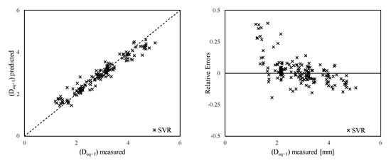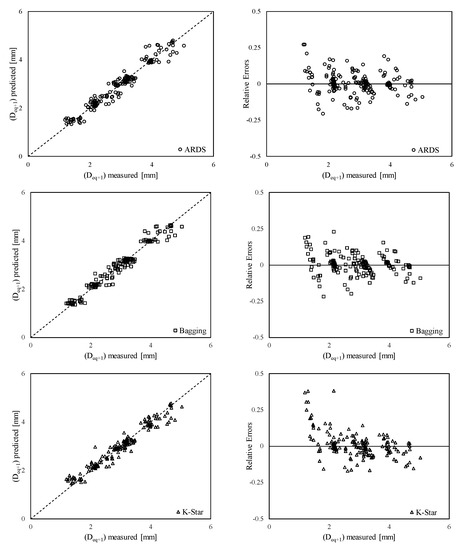The comparison between the predicted and measured values of Deq+1 shown in Figure 7 relates to Model 2. As in the previous case, the same figure also shows the relative error as a function of the experimental Deq+1. The error distributions were quite similar to those of Model 1, while the maximum relative errors were observed when Deq < 2.5 mm. In this case, both K-Star and SVR led to relative errors, in some cases greater than 30% in the forecasts for smaller bubbles.
