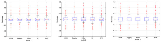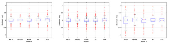 An alternative effective representation of the models’ errors in predicting Deq+1, in terms of residuals (i.e., absolute errors), is provided by the notched box plots in Figure 8. These plots show the range of errors with respect to the experimental values. The lower end of each box plot denotes the lower quartile Q1 (25th percentile), the upper end denotes the upper quartile Q3 (75th percentile), the band inside the box represents the median of the data. The whiskers extend from the bottom of the box to the smallest non-outlier and from the top of the box to the highest non-outlier in the dataset. The box plots further confirm what was previously argued in terms of the accuracy of the different models. It can also be noted that the variants of the models based on the Bagging and RF algorithms have their residual distributions characterized by greater symmetry than the others.