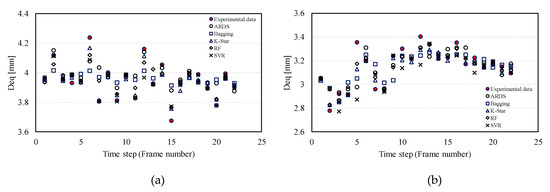 Figure 9 shows the Deq time series of two of the analyzed bubbles. Again, it can be observed that all models’ variants provided predictions in good agreement with the experimental data. In addition, it is interesting to note that higher errors were observed in correspondence with higher changes in the experimental values between two consecutive time steps. Finally, it may be worth highlighting that the algorithm that provided the most accurate predictions for a single bubble may be different from the algorithm that was the most accurate in the entire dataset.
