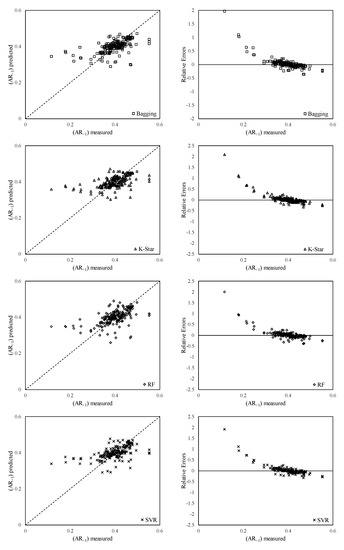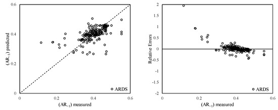 Figure 10 shows a comparison between the predicted and experimental values of AR+1, with reference to Model 1. In addition, it shows the relative error versus the measured AR+1.