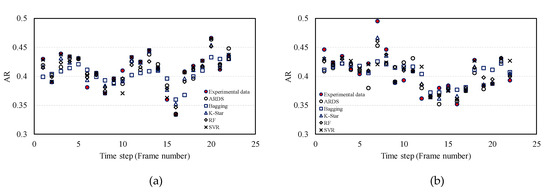 Figure 12 shows the AR time series of two of the analyzed bubbles. The results are better than what was expected on the basis of the analysis carried out above. They confirm that the model evaluation metrics have been significantly worsened by the results relating to bubbles characterized by very low aspect ratios. Therefore, it is reasonable to believe that the forecast models based on machine learning algorithms are able to provide accurate predictions of the aspect ratio of single bubbles, when used for bubbles whose characteristics are comparable to those used for model training.