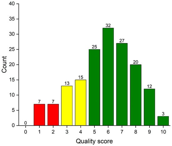 Figure 2 shows how the quality score varies by journals. The high-impact general medical journal Lancet had mean score of 6.9 (SD 1.7) while the mean score in the leading psychiatric journal JAMA Psy was 6.1 (SD 1.4). The quality core also identified the journals (IJERPH and JD) that publish more laboratory studies with smaller sample sizes. Articles published in these journals had lower scores, with a mean score of 5.2 (SD 2.3) in IJERPH and a mean score of 5.0 (SD 2.3) in JD. The mean values were statistically significantly different (p-value of ANOVA < 0.001).