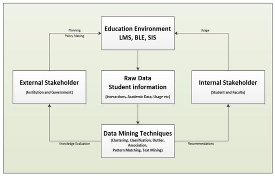 Data mining (DM) refers to the discovery of associable patterns from large datasets. It is a powerful tool in artificial intelligence (AI) and facilitates the categorization of data into different dimensions, identifying relationships and categorizing the information. This allows stakeholders to use the information extracted from DM and can help improve decision-making. Educational data mining (EDM) is a growing discipline which is used to discover meaningful and useful knowledge from data extracted from educational settings. Applying DM techniques, EDM provides researchers with a better understanding of student behavior and the settings in which learning happens, as shown in Figure 2 [,].
