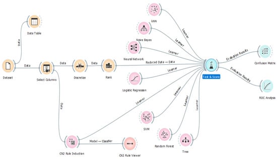 The main reason for testing several algorithms on the dataset was that their performance varies for the selected features. The study suggested that algorithms behave differently; depending on the dataset, the efficiency and performance may also vary. With this approach, it is easier to identify any one algorithm which suits the dataset with better accuracy and performance. For this purpose, a similar approach was used for this study. For the study, the Orange data mining tool was used in accordance with the process shown in Figure 4 [].