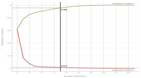 A principle component analysis (PCA) was undertaken to reduce the number of variables from 19 to eight components with a variance of 95.6%, as shown in Figure 5. Table 10 shows the PCA component variances.