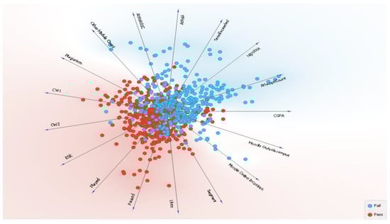 Multivariate visualization is one of the tools used in datamining and provides the starting point in an explorative study. With an increasing number of features, it requires some automatic means of finding good projections that would optimize criteria of quality and expose any inherit structure in the data. FreeViz is used for multivariate projection, which optimizes the linear projection and displays the projected data in a scatterplot. The target projection is found through a gradient optimization approach []. Figure 6 depicts the multivariant projection on the dataset; based on the target variable, the projection is made, and two clusters are easily visible. First, the cluster “pass” identified students that passed the module, with relationships in CW1, CW2, ESE, played, paused, likes, segment and Moodle activity either on campus or outside, all of which play a significant role in their overall pass performance; the second cluster, “fail”, identified students that failed the module, with relationships in at risk, SSC, high risk, term exceed, at risk, attempt count, CGPA and Moodle activity within the campus.