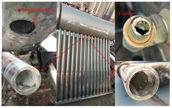 The fouling problem, which is regarded as “the main unresolved problem in heat transfer”, is mainly generated by the deposition of particulates, impurities, salts, and various organic species onto heat transfer surfaces [1,2,3]. It can be seen from Figure 1 that the fouling of calcium carbonate and magnesium carbonate accumulate on the tube surface of solar-energy and water-inlet of solar collectors. Due to the corrosion caused by long-term use of water delivery pipes and valves, iron oxides and copper oxides accumulate on the outlet of insulating water tank. Furthermore, the influence of corrosion products on the heat exchanger surface results in further corrosion of metal. After long periods of use in the circumstance of hard water, the solar collector has to be cleaned due to the serious blocking and the reduced efficiency. Fouling inevitably increases the fouling resistance and reduces the heat transfer effectiveness, thus bringing about higher fuel consumption, maintenance costs.