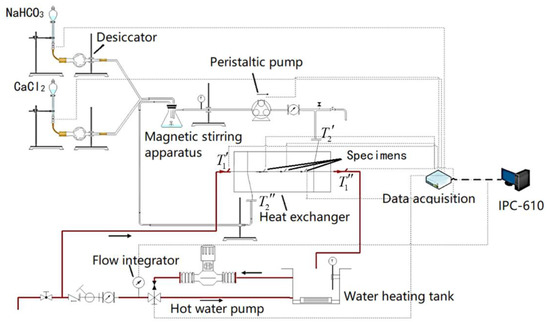 Figure 2 displays the schematic of the flowing fouling experimental rig. The experimental system is primarily composed of a water heating system (red line), a fouling solution system, and a data acquisition system. First of all, the water in the water tank was heated to 343 K by the heating rod, and then was pumped in the inner tube of the heat exchanger through the transmission of the water pump. The flow and temperature of the hot water were adjusted by the two-way regulating valve and the water tank power controller, respectively. When the inlet and outlet water temperatures in the heat exchanger were kept constant, 0.1 g/L CaCl2 solution and 0.1 g/L NaHCO3 solution in pear-shaped separating funnel were mixed to 0.1 g/L supersaturated solution through magnetic stirring apparatuses. With the increase of temperature and the change of flow rate, the crystals of calcium carbon in the supersaturated solution precipitate, resulting in the fouling deposition. The use of CaCl2 and NaHCO3 can be hydrolyzed into Ca2+, Cl−, Na+, and HCO3− in fouling solution [27], and then further electrolysis can occur. The dynamic reaction is as follows,