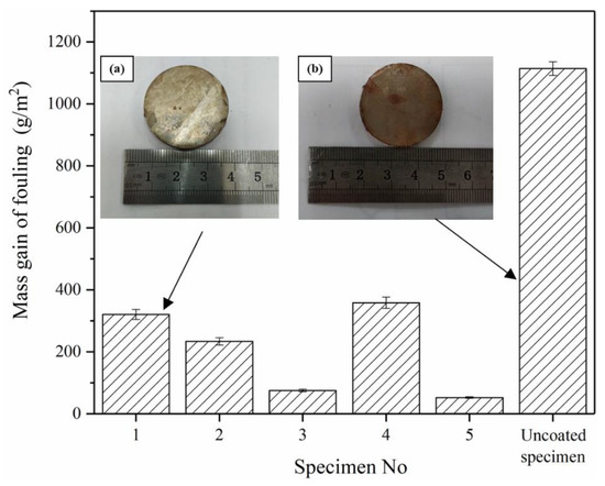 As shown in Figure 4a,b, fouling were deposited on the surfaces of the specimens. Compared with the fouling on the surface of the coated specimen, red products on the uncoated specimen were caused by the corrosion products generated on the bare substrate surface after the flow fouling experiment. Therefore, there are not only calcium carbonate fouling but also iron rust formed on the substrate surface. The result conforms to our previous studies [10,13] and proves that Ni-W-P has an admirable effect on anti-fouling performance. After calculating the mass change of the fouled specimens, it was found that there is no obvious rule between the mass change and the W content in the coating, while the certainty is that the mass gain of fouling on all the coated specimen is less than that of the bare substrate surface in the same period. Due to the difference of fouling adhesion, the deposit growth rate is the most significant parameter during the process [40], the thickness of fouling layer changes. As a result, the thermal resistance of the fouling layer also increases notably. In other words, the heat transfer coefficient of the untreated material has been affected partly due to the existence of Ni-W-P coating. As shown in Figure 4, the result reveals that the fouling on the surface of the specimen did not change significantly with the increase of W content. Because of the scouring effect of water flow and the influence of Van der Waals force in the molecules, the deposited fouling could fall off on the surface of the specimens and the mass change shows irregularly. Thus, the phenomenon of mass gain of fouling is inconsistent with our previous study in static fouled solution [10,16]. Whereas, it is certain that the existence of Ni-W-P coating, the surface tension decreases, which makes it more difficult for fouling to adhere and the deposition of fouling has been inhibited.