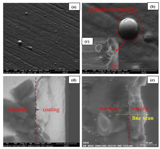 (a) Surface morphology of specimen 1 after electroless plating; (b) Surface morphology of nickel accumulation; (c) Cross-sectional morphology of nickel accumulation; (d) Back scattered-electron cross-sectional image of Ni-W-P coating of specimen 1; (e) Scattered-electron cross-sectional image of Ni-W-P coating of specimen 1.