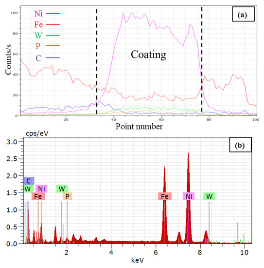 As can be seen in Figure 5b,c, the color of the tissue changes distinctly. It turns out that the globular morphology is filled with Ni[W,P] structure. The thickness of globular morphology is larger than that of the coating in Figure 5c. The possible explanation for this is the local inhomogeneity of the bare substrate surface that leads the excessive deposition of Ni[W,P] in the hole. Meanwhile, we cut the cross sections of several areas in order to calculate the heat transfer behavior of Ni-W-P coating. It was found that the thickness distribution of Ni-W-P coating after 2 h plating is 20 μm ± 2 μm. According to the Figure 6, there are apparent peaks of Ni, W, and P at the cross section. As the W and P elements were solid dissolved in the Ni crystal cell, the content of Ni element is obviously higher than that of the other two elements. Here, we calculate the heat transfer of the Ni-W-P coating uniformly without local distinction.