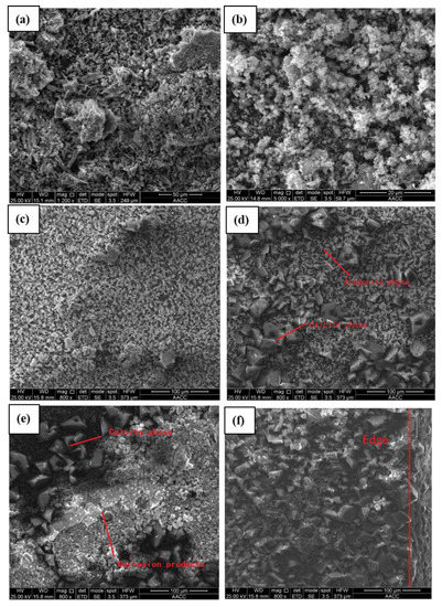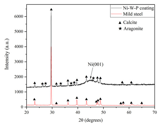 As shown in Figure 7, SEM tests were performed on specimens after 72 h of fouling. Figure 7a,b exhibit the surface morphology of the uncoated mild steel. It is notable that there are a large number of fouling deposits on the surface in the form of massive and columnar particles, as well as agglomerates. Columnar fouling is also surrounded by loose-cotton-flocculent fouling. Based on the previous results, uncoated mild steel is primary composed of massive calcite and columnar aragonite, while calcite-phase CaCO3 fouling takes up a high proportion. A considerable amount of fouling indicates that the induction stage of the fouling deposition process on the bare substrate was ended and the heat transfer of the specimen surface could be severely affected by the rapid growth of calcite-phase and aragonite-phase fouling. The deposited products on the surface of Figure 7c are principal acicular aragonite mixed with a small amount of massive calcite and oxide [41,42]. The grain sizes of aragonite were estimated to be significantly smaller than calcite grains [43]. In the vicinity of calcite-phase CaCO3 fouling (Figure 7e), oxidation products also deposit nearby. However, no oxidation products were found near the aragonite-phase CaCO3 fouling (Figure 7d). At the same time, we also carried out a typical observation at the edge of the specimens. It can be found that the edge of the specimen is covered by the calcite and oxide. No aragonite deposited on their margins. On the one hand, the fouling solution will periodically form the double-line vortices arranged regularly in opposite rotation direction when passing through the edge of the specimens. The formation of Kármán vortex street after the non-linear effect, leading to the increase of the pressure of fouling deposition on the edge of the specimen, as well as the difference of nucleation energy of the fouling lattice [44]. On the other hand, when the vortex appears, the fluid will produce a periodic alternating transverse force on the edge of specimens. The natural frequencies of similar phase of CaCO3 fouling nuclei keep close to each other, leading to resonance of the crystal nucleus and then the selective deposition of the corresponding phase fouling, as well as the nucleus growth. Further study on nucleation energy barriers and bonding changes of different crystal-phase CaCO3 fouling will be reported in Section 3.3 See Figure 8, the XRD patterns of fouling of coating and bare substrate show different. There is an amorphous peak due to the penetration of X-ray in thin fouling layer, which is according with the results of Figure 8. It also can be noticed that there are both diffraction peaks of calcium carbonate and amorphous peaks of Ni-W-P coating showing on the coated sample. However, as the fouling layer on the surface of the bare substrate is relatively thick, the X-ray is reflected when it reaches the surface of the fouling layer. Compared with the sole crystal form of CaCO3 on the bare surface, it indicates that more aragonite deposit on the surface of ternary Ni-W-P coating.