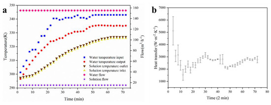 Figure 9b displays the heat transfers coefficient change of the measurable anti-fouling heat exchanger. It can be known that the heat transfer coefficient of the designed heat exchanger is stable at about 2500 W/m2·K after 1 h.
