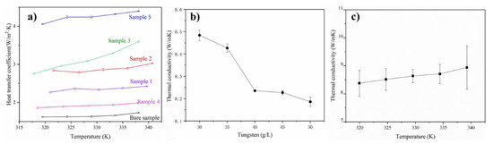 (a) Heat transfer coefficient of specimens after being fouled; (b) Thermal conductively of specimens varied with the temperature; (c) Thermal conductively of specimens varied with tungsten content.