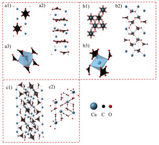 Structure of three crystal calcium carbonate (a1–3) calcite; (b1–3) aragonite; (c1–2) vaterite; (d1–3) density of state of calcite, aragonite, and vaterite.