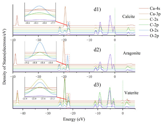Figure 11d1 shows the PDOS of calcite. It can be viewed that the peaks of 3p orbit of calcite are at −19, −18, −8 eV and the peaks of 4s orbit is at −38 eV. On the bonding of Ca-[CO3], 3p orbit of Ca and the 2s orbit of O have obvious resonance at −18 eV. Additionally, resonances are established by the 2p orbit of C and the 3p orbit of Ca at −18 eV, indicating that they are likewise bonded. Comparing with the PDOS in Figure 11d1,d2, we can find that the orbit peaks of the two phases are virtually similar, which manifest that the bond strength and type of them are near-identical [49]. In Figure 11d2, the resonance peaks of the 2s orbit of O and the 3p orbit of Ca at −18 eV are sharper than that of the calcite. This is because the difference of the coordination number of Ca with [CO3] in the two different-crystal structures. Their coordination number is 6 and 9, respectively. From the PDOS of vaterite in Figure 11d3, it is clearly observed that the resonance region shifts to the negative direction obviously and 2s orbit of C resonates with the 4s orbit of Ca at −42 eV. Meantime, 2p orbit of C contributes to 3p orbit of Ca at −24 and −22 eV, which proves that Ca have a stronger effect on C in the vaterite phase structure and leads to multi-orbit bonding of Ca-[CO3]. Antibonding orbits in vaterite move to the negative direction as a whole compared with calcite and aragonite, showing that the bonding effect in vaterite decreases.