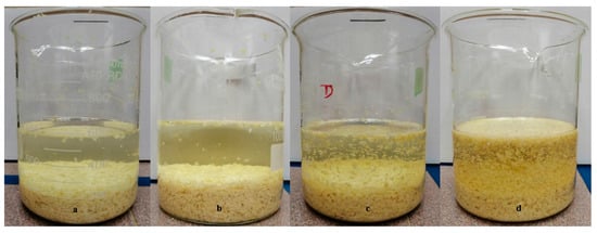 Rubber crumbs surface treatment using NaOH solution: (a) 1%, (b) 4%, (c) 7%, and (d) 10%.
